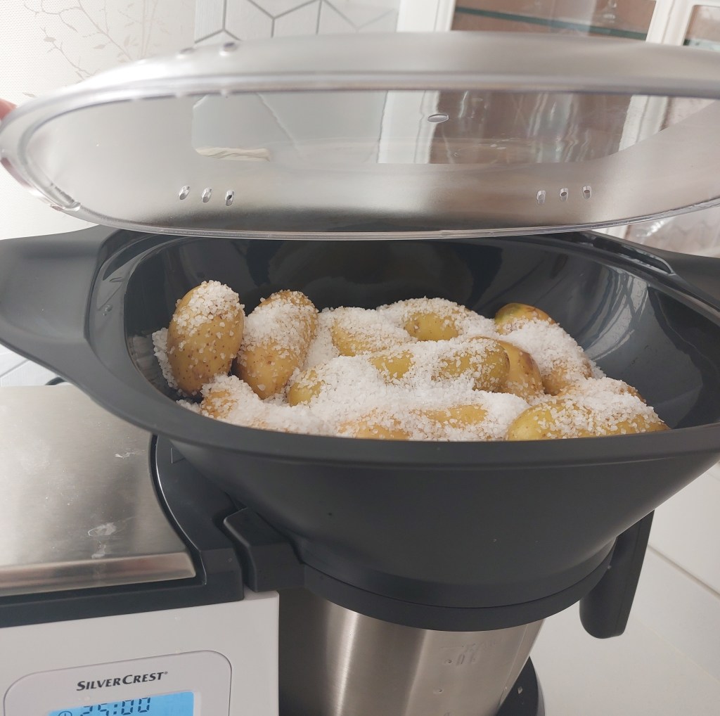 Selecciona el botón vaporera, 25 minutos. Después de este tiempo pincha una patata para ver si están hechas. Si las notas duritas, ponle 5 minutos más.