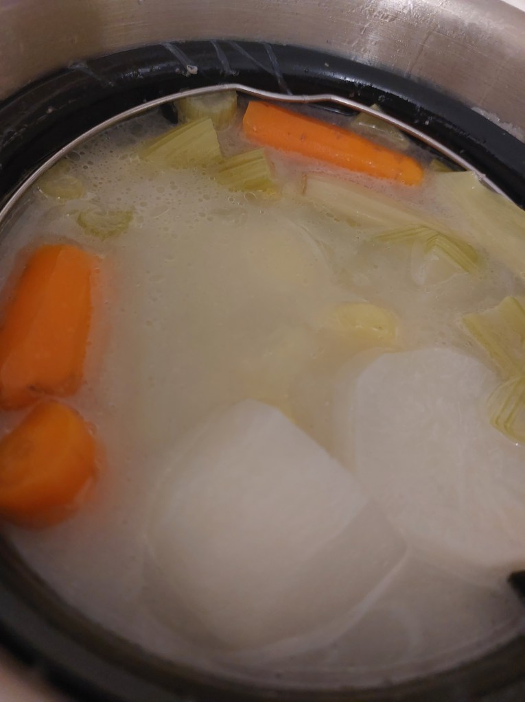 Verduras: 1 patata, media cebolla, 2 ramas de apio, 1 nabo, 1 zanahora, medio puerro.