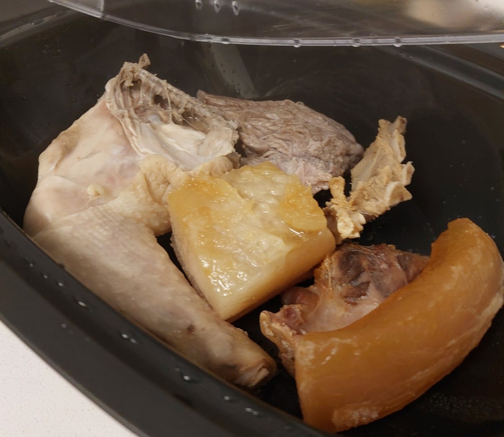 Avíos del puchero: 1 contramuslo de pollo, 1 hueso blanco, 1 hueso espinazo, costillas, corteza o añejo, tocino fresco y tocino salado.