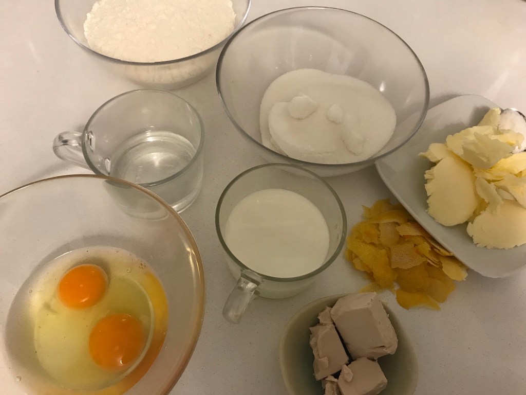 MASA: 110 gr azúcar, 2 huevos, 30 gr levadura fresca, 40 gr agua de azahar, 150 gr harina de fuerza, 1/2 cucharadita de sal, la piel de 1 limón y de 1 naranja, 30 gr leche, 60 gr mantequilla.