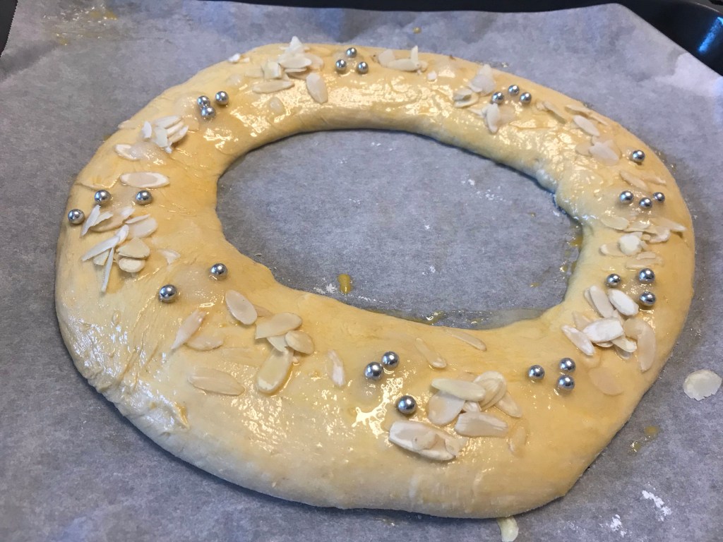 Poner la masa sobre una superficie limpia y enharinada. Amasar y formar una bola. Hacer un agujero en el centro. Poner en la bandeja del horno sobre un papel de hornear. Pintar con el huevo batido. Decorar con las almendras laminadas, el azúcar humedecida con agua y las bolitas de anís.