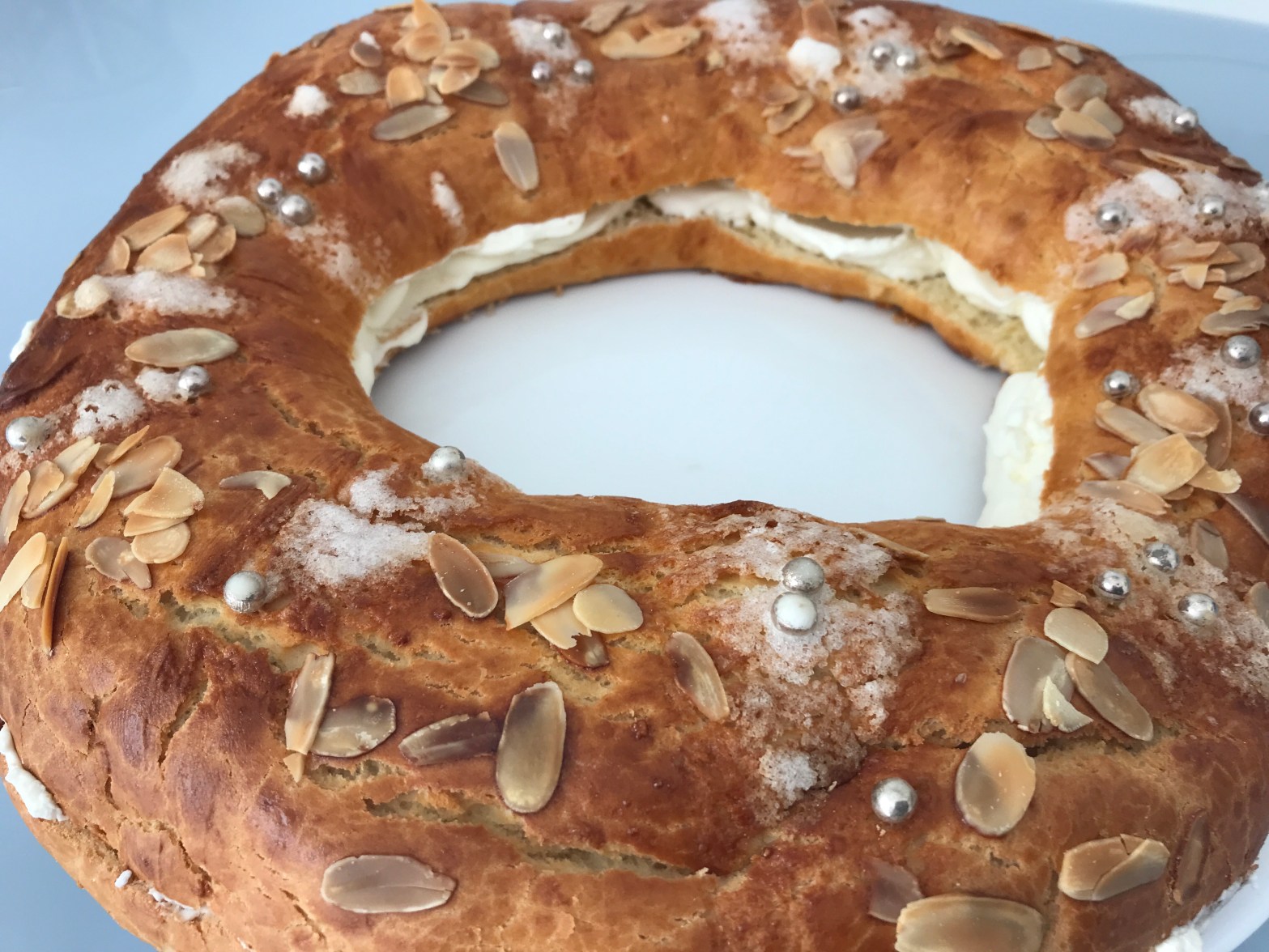 Poner la masa sobre una superficie limpia y enharinada. Amasar y formar una bola. Hacer un agujero en el centro. Poner en la bandeja del horno sobre un papel de hornear. Pintar con el huevo batido. Decorar con las almendras laminadas, el azúcar humedecida con agua y las bolitas de anís.