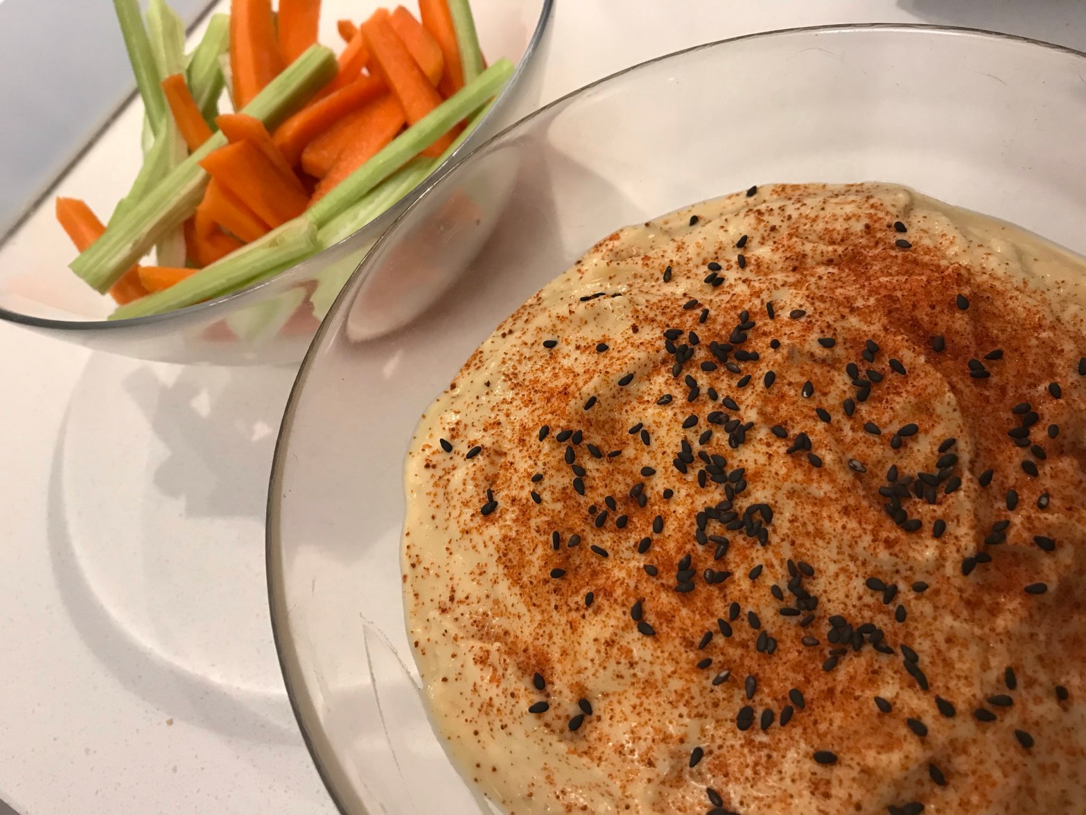Decora con pimentón dulce y algunas semillas de sésamo tostado. Para comértelo, puedes cortar unas tiras de zanahoria y de apio para mojarlas en el humus o untarlo en unas tostas.