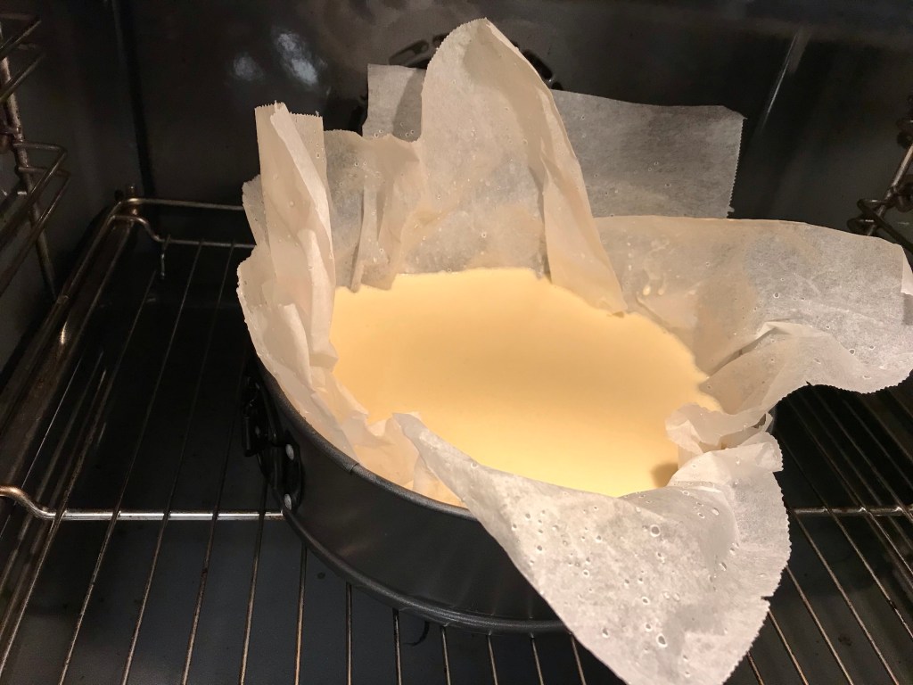 Coge dos papeles de horno, humedécelos en introdúcelos en el molde y echa la mezcla en el molde y hornea a altura media durante 40-45 minutos a 200 º. Dejar enfriar y meter en el frigorífico.