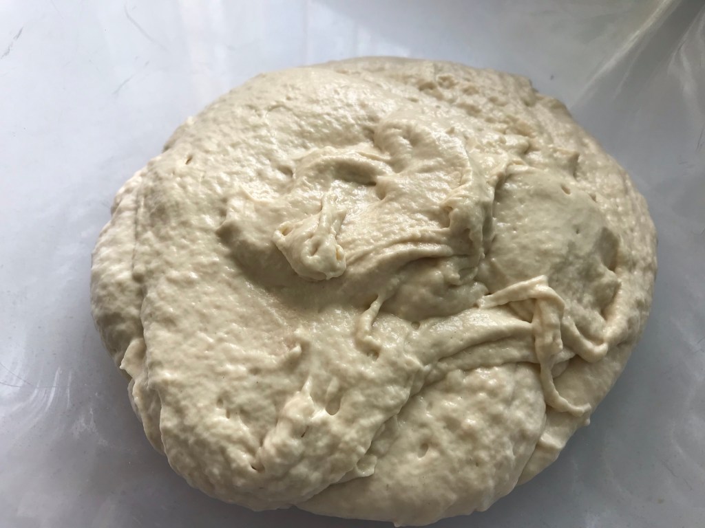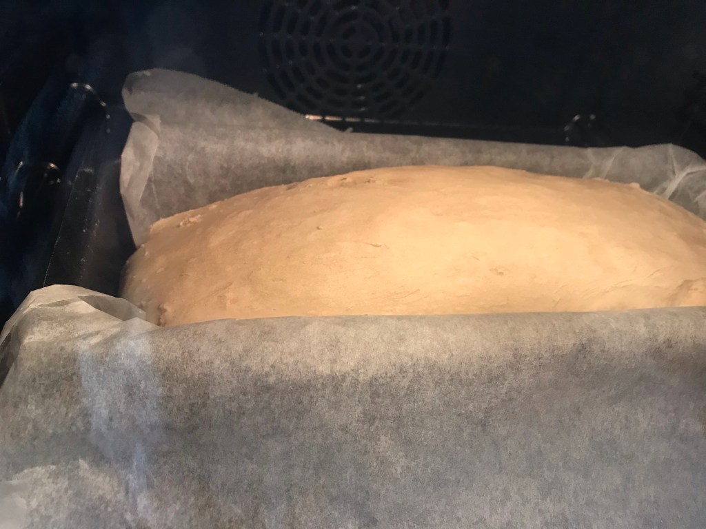Sobre la encimera limpia echa harina y vierte la masa. Amásala con las manos. Cuando se despegue bien de las manos, pon la masa dentro de un molde alargado con papel de horno. Deja reposar tapada la masa dentro del molde 1 hora.