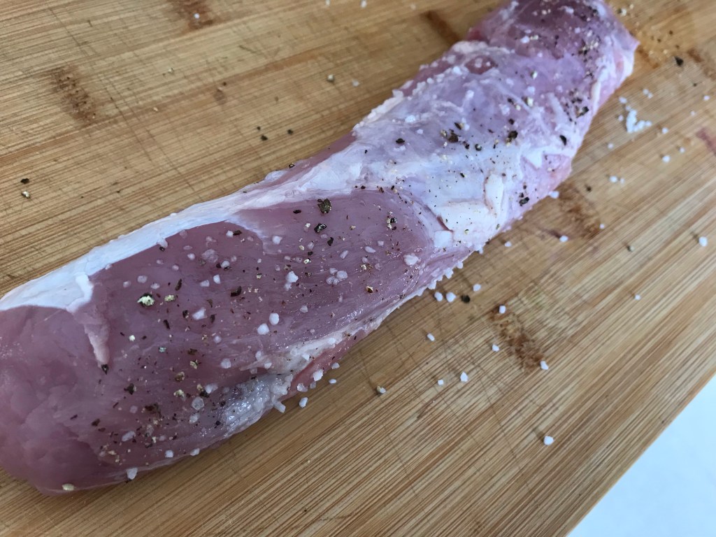 Salpimenta el solomillo por todos los lados. Envuélvelo con el bacon y sujétalo con los palillos de diente.